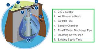 The Allerton ConSept will convert your existing septic tank or cesspool into a fully functional sewage treatment plant producing a final effluent that can be discharged into a watercourse or soakaway. The raw sewage passes along the incoming sewer pipe (6) and enters the existing septic tank (7). This is the aeration zone, air is supplied from the blower (2) along the air inlet pipe (3) and causes agitation in this area helping to break up the solids in the raw sewage.